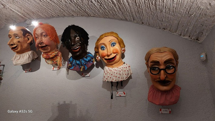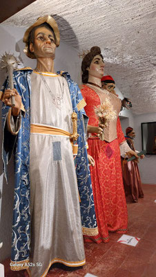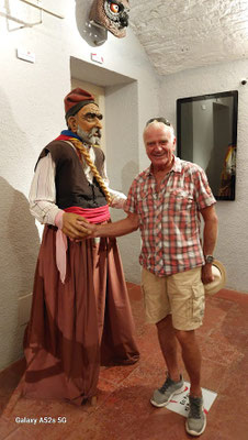 Bilder unten: Besondere Beachtung fanden die Giganten Torroellas und ihr Gefolge: Schwellköpfe ("Cap grossos") und "Bestien" (das Bild unten zeigt einen Drachen und einen Adler). Die Giganten werden bei der Festa Major und im Fronleichnamszug ("Corpus Christi") mitgeführt. Diese typisch katalanische Tradition ist natürlich auch in Torroella vertreten, wobei die Figuren lokale Bezüge haben. Das Gigantenpaar zeigt bäuerliche Züge und besaß früher tatsächlich eigenen Landbesitz (aus dem ihre Kosten bestritten wurden). Wie es im Inneren der riesigen Figuren aussieht, zeigt das zweite Bild, wobei es ersichtlich wird, wie schwer es für die Träger ist, die Gestalten zu bewegen und sogar damit zu tanzen. (Der Träger schlüpft in den unteren Teil.)