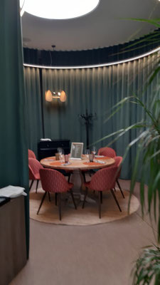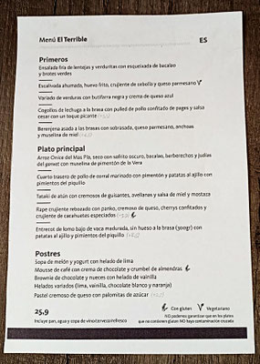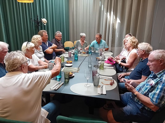 Señora Laura, die „Maîtresse d’hôtel“, empfängt uns freundlich und weist uns eine große Tafel in einem durch Vorhänge abgetrennten Raum zu. Das Restaurant wird vom Chef und Koch eines Michelin empfohlenen Restaurants in Pals betrieben. Demensprechend ist das Menü, das wir einnehmen: gehobene Klasse und natürlich auch gehobener Preis. Ich und - soweit ich beurteilen kann - auch die anderen waren von Zubereitung, Qualität und Geschmack angetan.