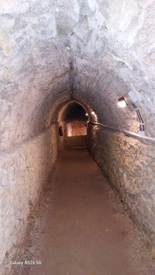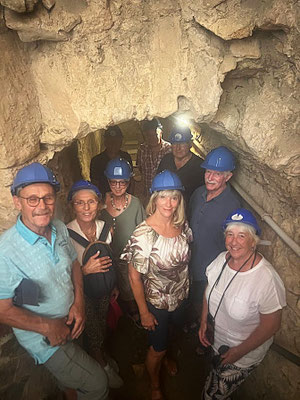 Wir erhalten Schutzhelme und machen uns mit Cristina auf den Weg zum Eingang der Mina. Unser Gang führt uns durch den Carrer dels Dolors an alten Häusern vorbei zum Carrer del Mar, in der Nähe der alten Stadtmauer. Dort liegt der heutige, vergitterte Eingang zur Mina, Früher war hier ein Brunnen, der schon 1368 erwähnt wird, den es heute nicht mehr gibt. Der Blick die Treppen hinunter zeigt uns, dass der Stollen mannshoch ist und kein Wasser führt. 2015 wurde die Mina de l´aigua für die Besichtigung geöffnet, nachdem sie mit nicht geringen Kosten begehbar gemacht und mit Sicherheitseinrichtungen, Licht und Belüftung ausgestattet wurde.