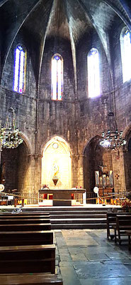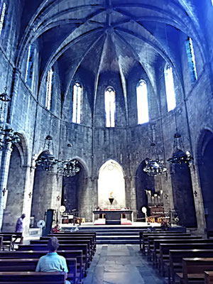 Wir gehen zur Kirche Sant Genís hinüber - benannt nach Ginesius von Arles, enthauptet 303 in der Diokletianischen Christenverfolgung. Beim Eintreten beeindruckt die Weite und Höhe der Hallenkirche. Ihre relative Dunkelheit ist typisch für den Stil der katalanischen Gotik. Tatsächlich ist sie eine der weitesten gotischen Kirchen Kataloniens. Der Innenraum diente auch als Königshalle bei königlichen Besuchen, wobei man ihn sich ohne Sitzbänke im Mittelalter vorstellen muss. Sant Genís wurde ab dem 14. Jh. an Stelle einer romanischen Vorgängerkirche erbaut, aber erst im 17. Jh. fertiggestellt (Weihe 1609); die gotische Konzeption des Innenraumes wurde dabei beibehalten. Das Baumaterial der Kirche ist Kalkstein vom Montgrí. In der Barockzeit errichtete man den großen Glockenturm, fügte die Seitenkapelle „Capilla Fonda“ an das Kirchenschiff an und versah die Eingangsseite der Kirche mit einer Barockfassade.