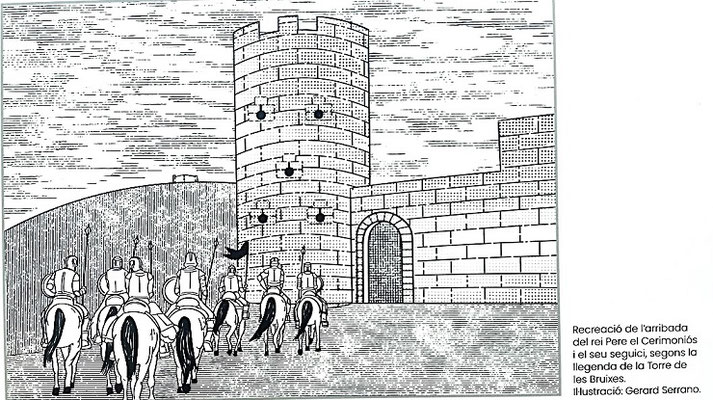 Der Hexenturm mit dem zugemauerten Tor. Unten: Eine zeichnerische Rekonstruktion des versuchten Einzugs von Pere III. und seinem Gefolge durch das Tor am Hexenturm. (Zeichnung auf Tafel am Hexenturm)