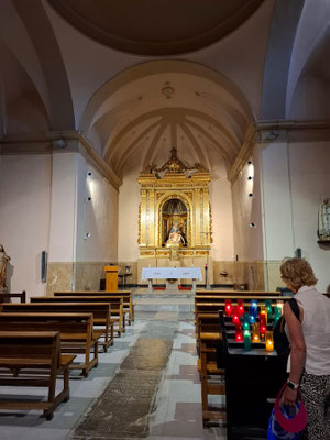 Sant Genís Toroella de Montgrí - Blick in den Kirchenraum und die Apsis mit der Statue des Kirchenpatrons. Rechts die Seitenkapelle Capilla Fonda. Unten: Statue des Kirchenpatrons Sant Genís über dem Altar und Darstellung der schmerzensreichen Mutter Jesu in der Capilla Fonda