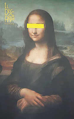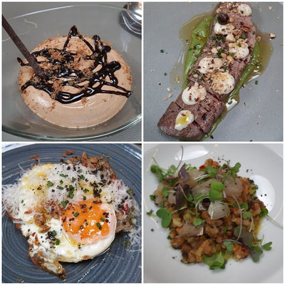 Bilder: Unsere Tafel - wir warten auf das Essen unter dem Plakat einer Mona Lisa, die mit ihren schönen Augen nicht auf uns blicken darf - warum wohl? Eine Auswahl servierter Teller - schön gerichtet, oder? Und das ist das Menü, aus dem wir wählen können.