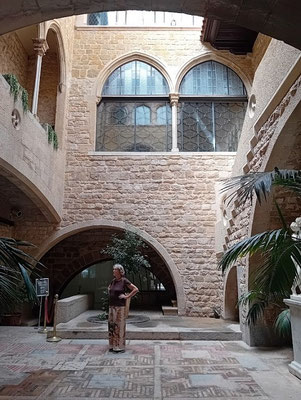 Am alten Waschhaus vorbei gelangen wir durch eine Gasse zur Plaça Quintana. Vor uns erstreckt sich der mit einigen hohen Palmen besetzte frühere Garten der Casa Quintana. Wir treten ein und sehen rechts das moderne Gebäude der Bibliothek und links das prächtige Herrenhaus der Familie Quintana. In ihm ist heute das Museu de la Mediterrània untergebracht.
