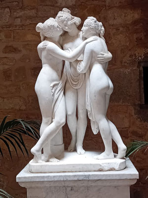 Wir betreten die Eingangshalle, die deutlich den Modernisme-Stil Masós zeigt, hier mit mittelalterlichen Reminiszenzen. So stellte man sich eine königliche Empfangshalle vor. Auch die Statue dreier ineinander verschlungenen Frauengestalten bezeugt die Zeit des Modernisme.