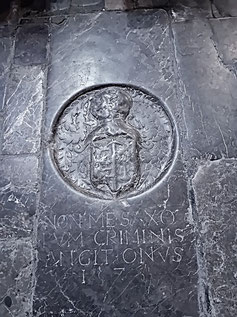 Im Mittelgang des Schiffs kann man eine Grabplatte mit einer interessanten Inschrift entdecken: