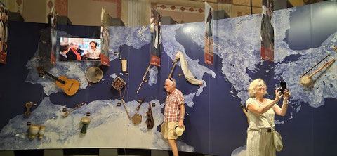 Blick in eine der Museumsinstallationen: In einer Projektion des Mittelmeerraumes sind die die Regionenen kennzeichnenden Musikinstrumente drapiert - Im Hintergrund die klassizistisch bemalten Wände der Quintana- Wohnräume.